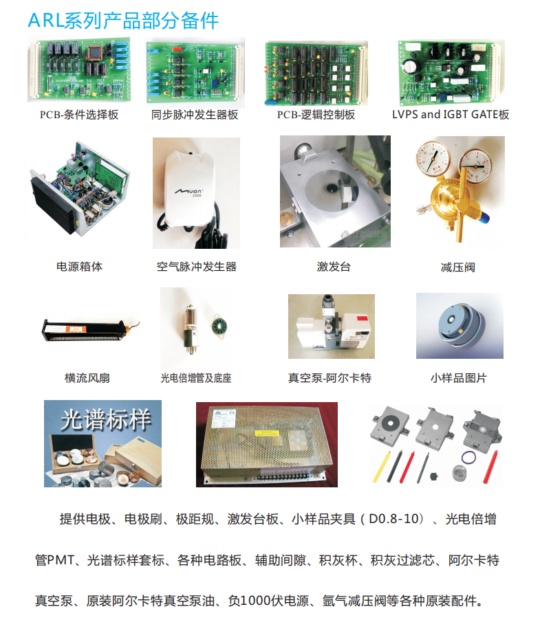 •   ARL直讀光譜儀配件耗材備品備件 上海鑄金分析儀器有限公司可供應各型號ARL直讀光譜儀、ARL直讀光譜儀軟件、ARL直讀光譜儀備品備件、ARL直讀光譜儀配件耗材。如果您對ARL3460、ARL4460、ARL8820、ARL8860光譜儀(金屬分析儀)有相關需求,均可聯系鑄金。ARL直讀光譜儀備件耗材如:電極、電極刷、極距規、激發臺板、小樣品夾具( D0.8-10)、光電倍增管PMT、光譜標樣套標、各種電路板、輔助間隙、積灰杯、積灰過濾芯、阿爾卡特真空泵、原裝阿爾卡特真空泵油、負1000伏電源、