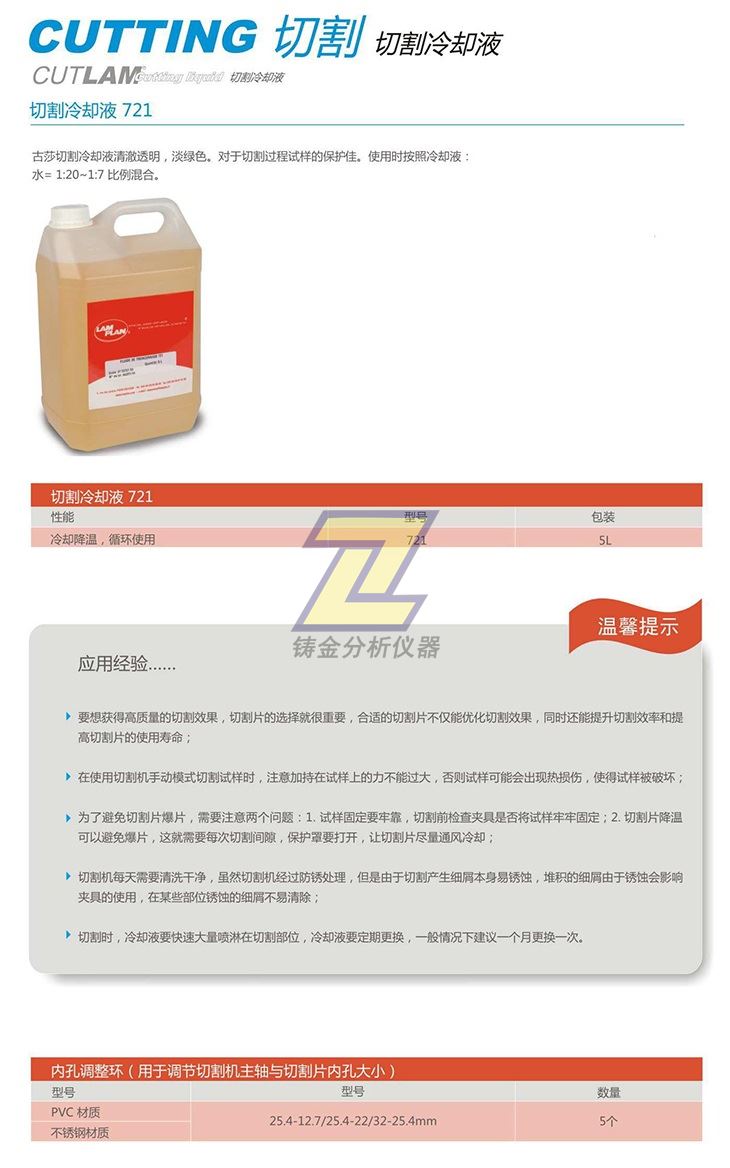 上海鑄金分析儀器有限公司供應多系列的切割冷卻液、金相切割片、金剛石切割片、金相砂紙、拋光布、鑲嵌料等進口or國產金相分析耗材、金相分析配件以及金相切割、研磨、拋光、鑲嵌、腐蝕、顯微鏡觀察分析等金相制樣分析儀器設備。本切割冷卻液清澈透明,淡綠色。對于切割過程試樣的保護佳。使用時按照冷卻液:水=1:20~1:7比例混合。