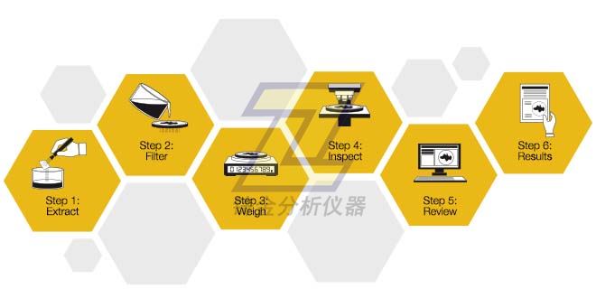 清潔度檢查的標準流程:準備(步驟 1-3)和調查(步驟 4-6)。第1步:提取,第2步:過濾,第3步:稱重,第4步:檢測,第5步:復審,第6步:結果。