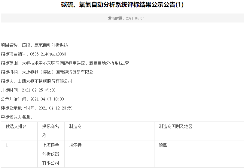 鑄金中標(biāo)太鋼碳硫、氧氮自動(dòng)分析系統(tǒng)項(xiàng)目