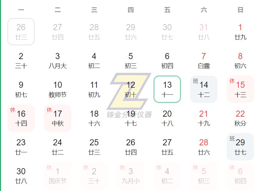 上海鑄金分析儀器有限公司2024年中秋節放假安排