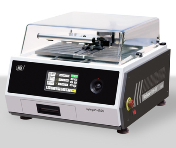 •   精密切割機iqiege650S簡介:iqiege650S精密切割機適用于對金屬、電子元件、陶瓷材料、晶體、硬質合金、巖樣、礦樣、混凝土、有機材料、生物材料(齒、骨)等材料進行精密的無變形切割。 該設備采用PLC控制,定位精度高;調速范圍大;切割能力強;強循環冷卻系統;可預設進刀速度;大觸摸屏控制顯示;易于操作控制;自動切割可減少操作者的疲勞,保證了試樣制作的一致性;并對整個切割過程進行實時監控,報警提示;寬大明亮的帶安全開關切割室,是企業及科研院所制備高品質試樣的理想設備之一。精密切割機iqiege650