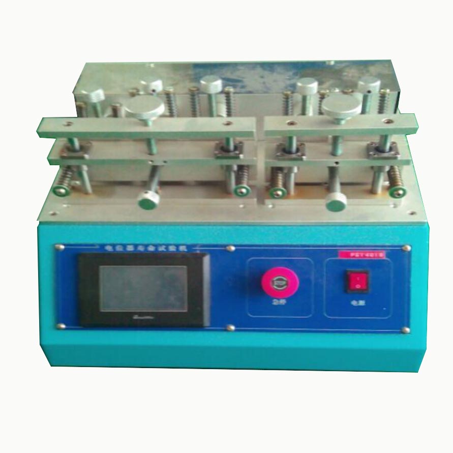 電位器旋轉(zhuǎn)壽命試驗機產(chǎn)品概述:本機采用PLC觸摸屏加步進電機控制,可對旋鈕電位器進行壽命測試。機器可設(shè)定0-360度旋轉(zhuǎn),旋轉(zhuǎn)角度可調(diào)節(jié)(手動調(diào)節(jié),帶數(shù)字輸入)。本機具有速度可調(diào)、轉(zhuǎn)角度可以設(shè)定,次數(shù)設(shè)定,并達到次數(shù)后數(shù)據(jù)保持停機。放置產(chǎn)品時要對電位器和機器旋轉(zhuǎn)角度原點(及0度位置)。電位器旋轉(zhuǎn)壽命試驗機技術(shù)參數(shù):1.測試工位:5組(同步工作)2.電機:86步進電機加減速箱 3.控制方式:觸摸屏控制4.次數(shù):0~999999次(可設(shè)定)5.速度:3~30c.p.m可調(diào)6