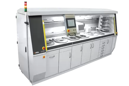 緊湊的自動(dòng)化單元Qpol 250BOT將研磨和拋光工位、聲波清洗工位、介質(zhì)更換器、加液系統(tǒng)和一個(gè)集成的沉淀槽結(jié)合到一臺(tái)機(jī)器中,并與系統(tǒng)實(shí)驗(yàn)室無(wú)縫集成。通過(guò)觸摸屏的直觀操作和一個(gè)用戶友好的擰緊和松開(kāi)樣品夾具的系統(tǒng),可以快速得到結(jié)果。Qpol 250BOT提供便利和性。由QATM設(shè)計(jì)和的Qpol 300BOT緊湊型自動(dòng)制樣系統(tǒng)提供全自動(dòng)的研磨和拋光,包括清潔和干燥程序。可視化的程序控制檢測(cè)/記錄每個(gè)過(guò)程,使其在任何時(shí)候都是可記錄和可重復(fù)的。這些工位可以根據(jù)要求組合成4位或8位的系統(tǒng)集成版本。