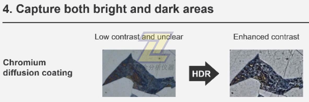 采用XJ圖像處理技術的高動態范圍(HDR)可調整圖像內的亮度差異,從而減少眩光。該功能還有助于增強低對比度圖像的對比度。HDR可用于觀察電子器件中的微小結構并識別金屬晶界。